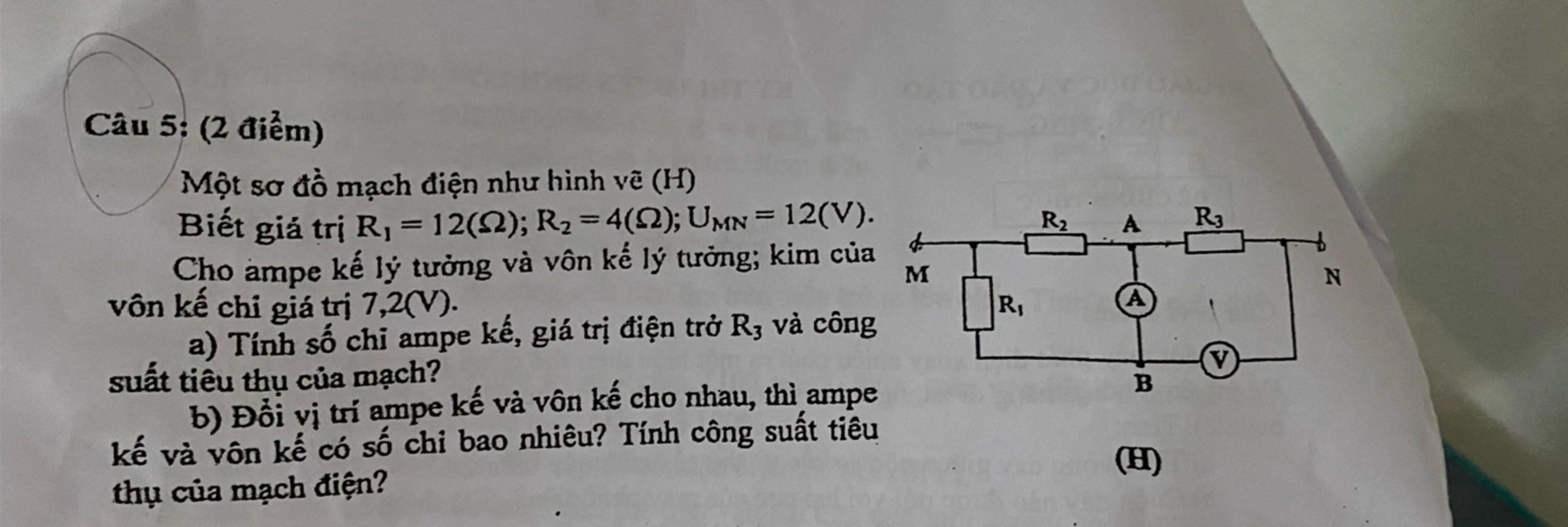 $b)$ Đổi vị trí vôn kế và ampe kế cho nhau, mạch điện: $R_1 // (R_2 nt R_3)$