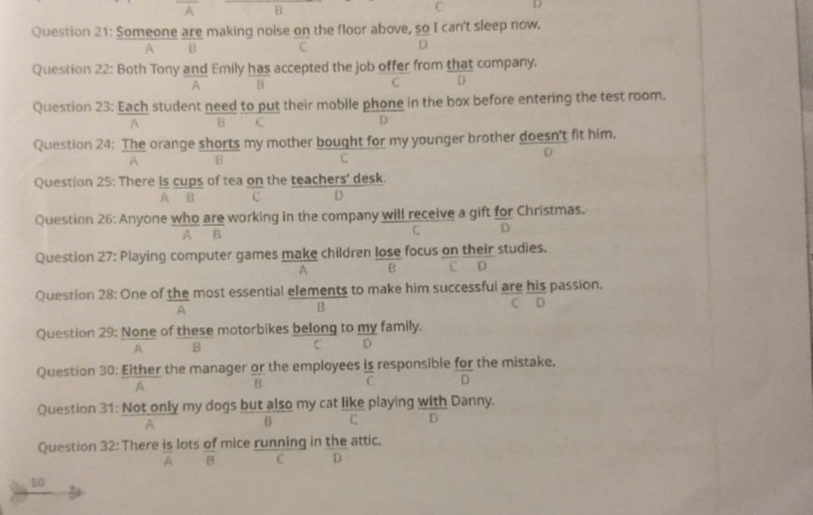 21 Someone are making noise Someone is making noise "Someone" là số ít, nên động từ phải là "is".