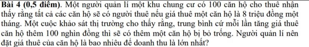 `->`Vậy Người quản lí nên đặt giá thuê 9.000.000 đồng/căn hộ để đạt doanhthu lớn nhất: 810 triệu đồng.