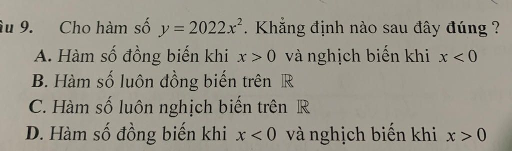 Hàm số `y=2022x^2` có `a>0` `=>` hàm số đồng biến khi `x>0`, nghịch biến khi `x< 0`