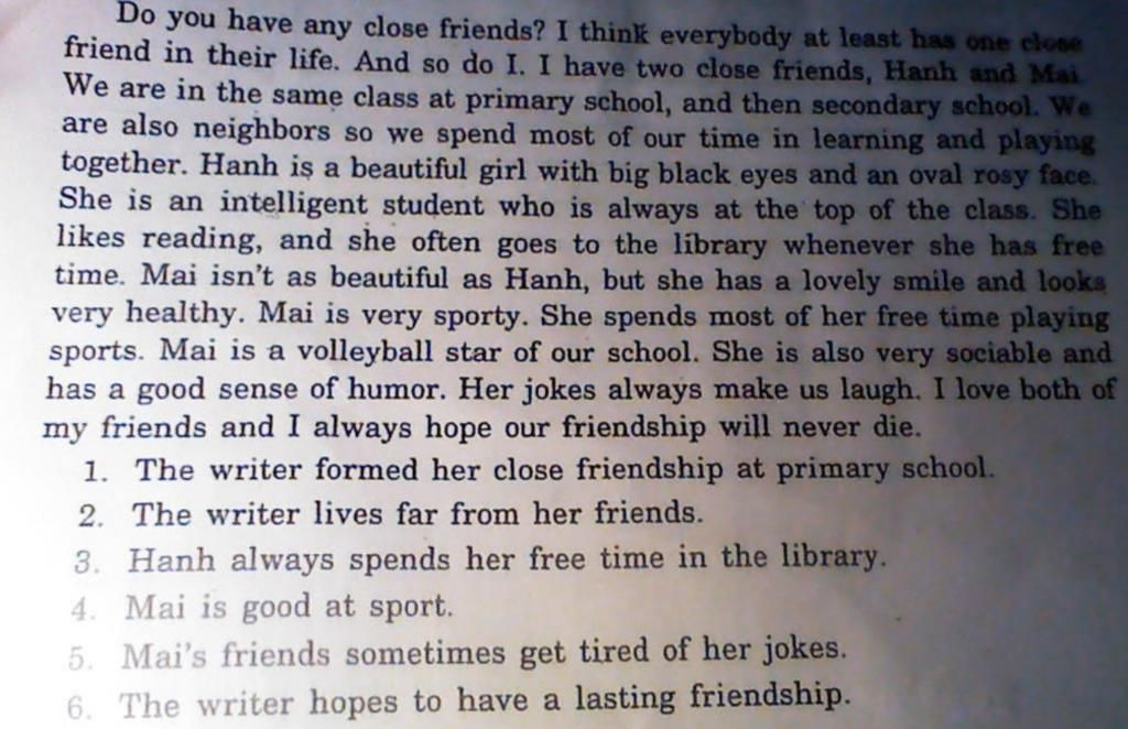 Do you have any close friends `?` I think everybody at least has one close friend in their life. And so do I. I have two close friends, Hanh and Mai. We are in the same class at primary school, and then secondary school. We are also neighbors so we spend most of our time in learning and playing together. Hanh is a beautiful girl with big black eyes and an oval rosy face. She is an intelligent student who is always at the top of the class. She likes reading, and she often goes to the library whenever she has free time. Mai isn't as beautiful as Hanh, but she has a lovely smile and looks very healthy. Mai is very sporty. She spends most of her free time playing sports. Mai is a volleyball star of our school. She is also very sociable and has a good sense of humor. Her jokes always make us laugh. I love both of my friends and I always hope our friendship will never die.