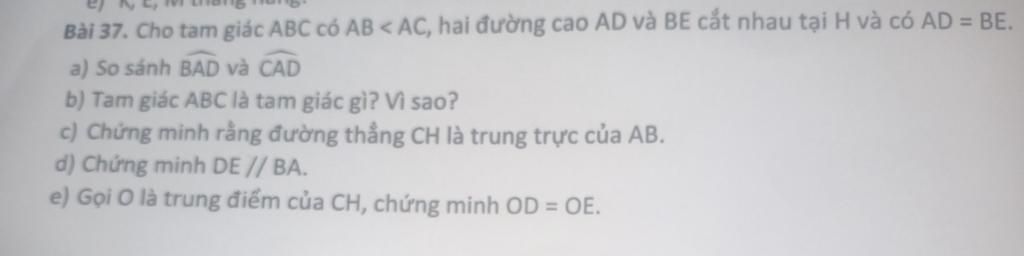Bài 37. Cho tam giác ABC có AB < AC, hai đường cao AD và BE cắt nhau tại H và có AD = BE.