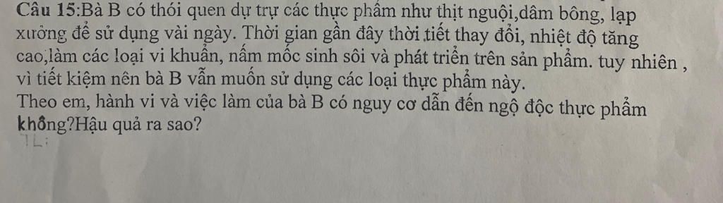 `+)` Theo em hành vi và việc làm của bà B có nguy cơ dẫn đến ngộ độc thực phẩm.
