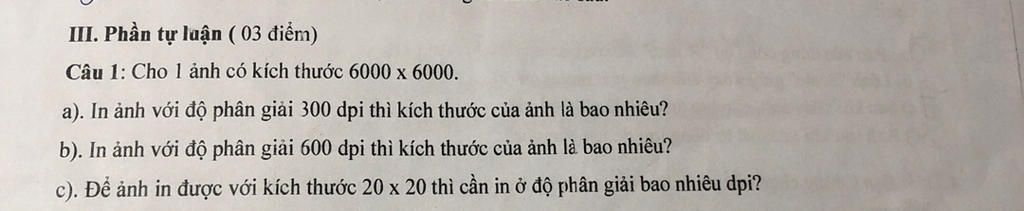 => Ảnh có độ phân giải là 600 (dpi) thì in ra có kích thước là 10x10 (in)