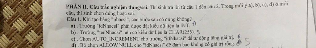 `c)` gán AUTO_INCREMENT cho idNhacsi để MySQL tự động tăng giá trị.