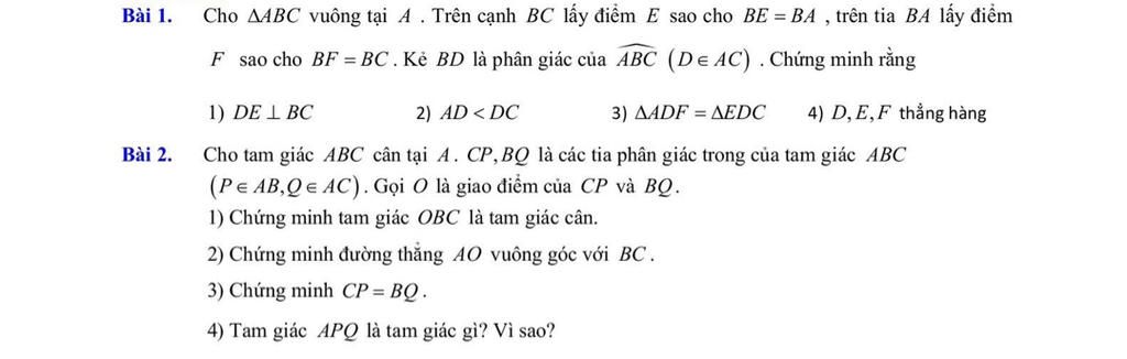 F sao cho BF = BC. Kẻ BD là phân giác của ABC (DeAC) . Chứng minh rằng