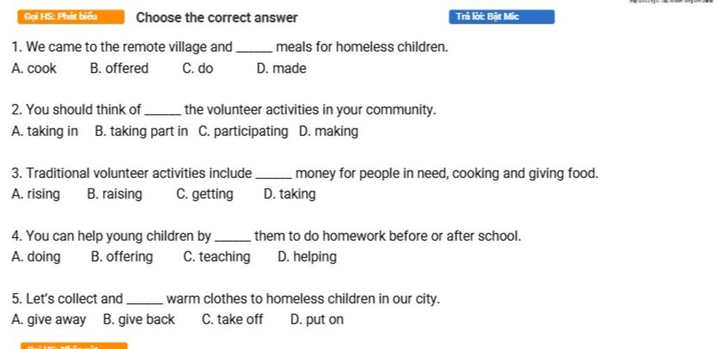 `-` Trans : Các hoạt động tình nguyện truyền thống bao gồm gây quỹ cho những người gặp khó khăn, nấu ăn và cung cấp thực phẩm.