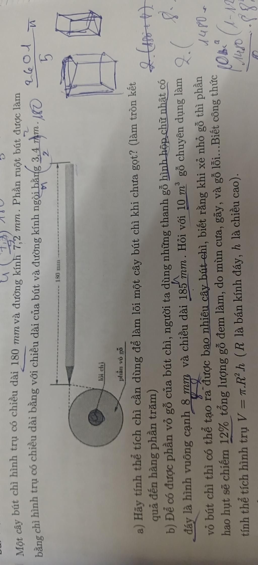 Một cây bút chì hình trụ có chiều dài 180 mm và đường kính 7,2 mm. Phần ruột bút được làm