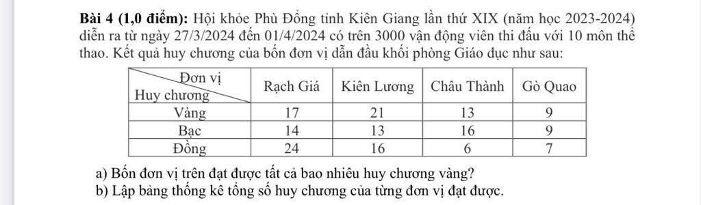 `b)` \begin{array}{|c|c|c|}\hline \text{Tên địa điểm}&\text{số huy chương}\\\hline \text{Rạch Giá}&\text{55}\\\hline \text{Kiên Lương}&\text{50}\\\hline \text{Châu Thành}&\text{35}\\\hline \text{Gò Quao}&\text{25}\\\hline\end{array}