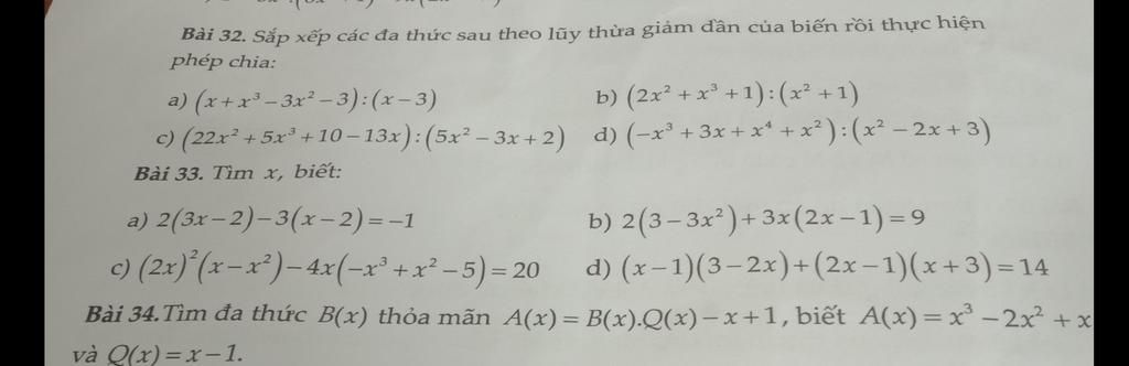 Bài 32. Sắp xếp các đa thức sau theo lũy thừa giảm dần của biến rồi thực hiện