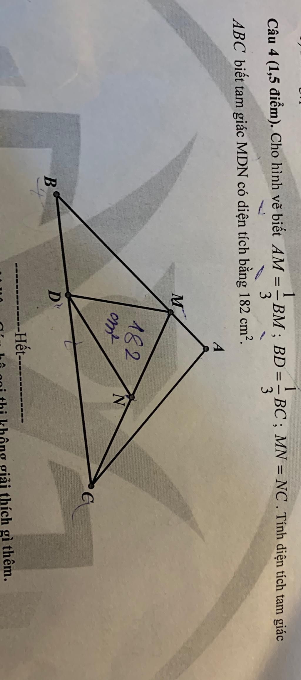 Diện tích tam giác `MDN =1/2` diện tích tam giác `MDC` vì có chung chiều cao hạ từ đỉnh `D` xuống và đáy `MN=1/2 MC`