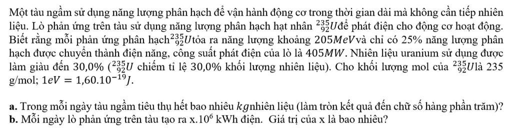 Mỗi ngày lò phản ứng trên tàu tạo ra `405*10^6*84600=3,4992*10^13 \ (J)`
