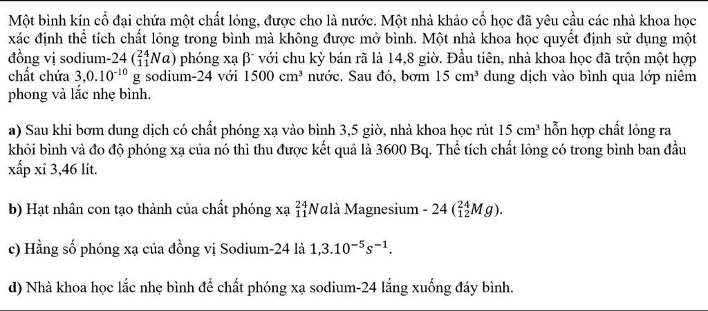 Một bình kín cổ đại chứa một chất lỏng, được cho là nước. Một nhà khảo cổ học đã yêu cầu các nhà khoa học xác định thể tích chất lỏng trong bình mà không được mở bình. Một nhà khoa học quyết định sử dụng một đồng vị sodium-24...