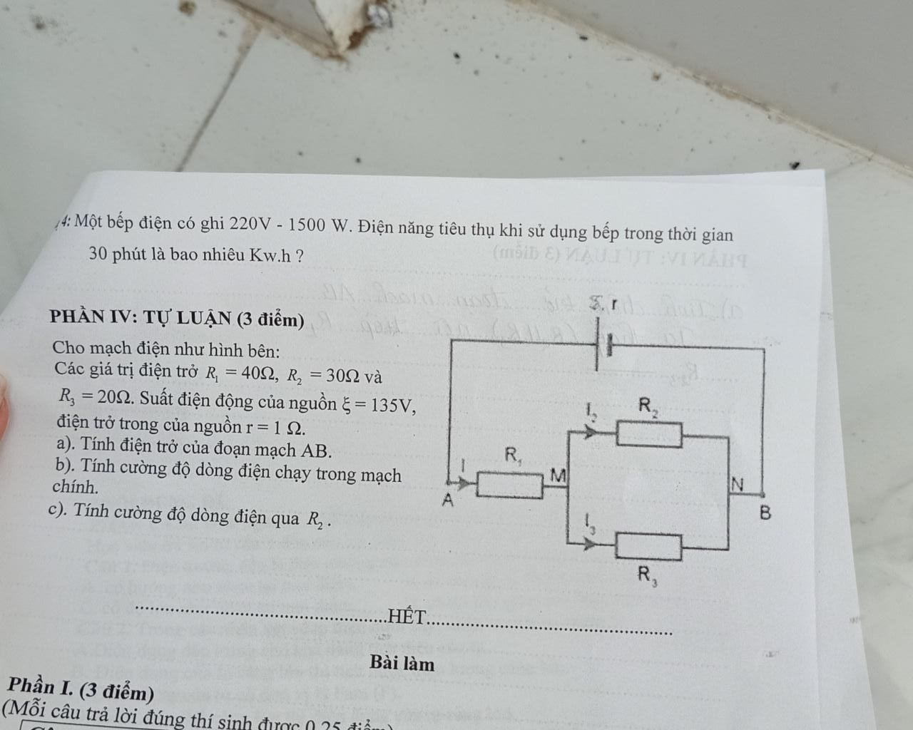 \(I = \dfrac{E}{{{R_{AB}} + r}} = \dfrac{{135}}{{52 + 1}} = \dfrac{{135}}{{53}}A\)
