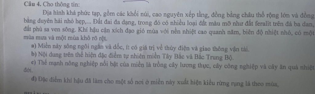 b) Nội dung trên thể hiện đặc điểm tự nhiên miền Tây Bắc và Bắc Trung Bộ.