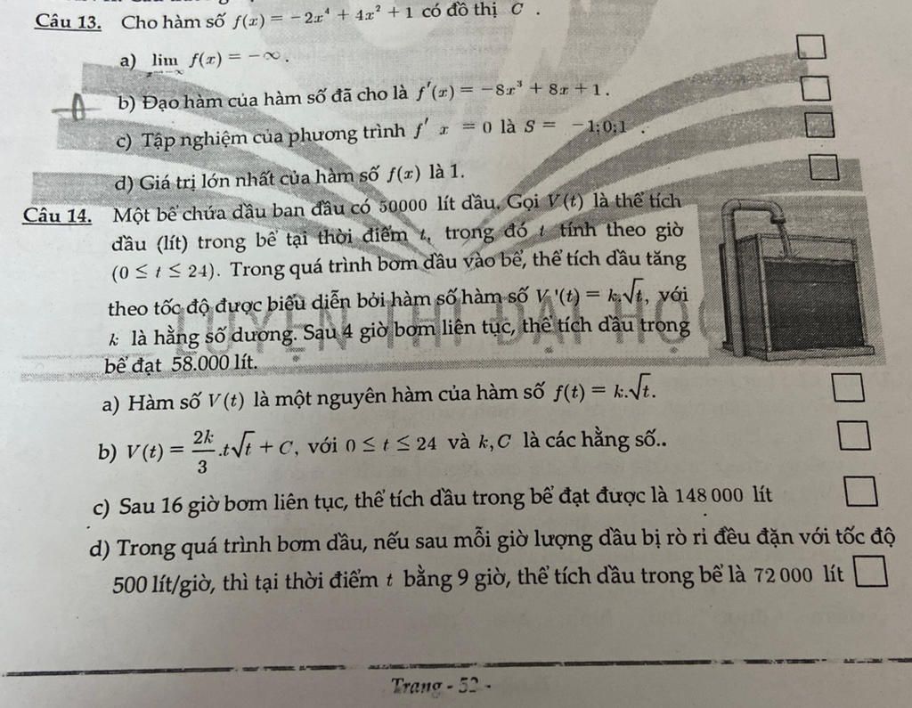 Câu 14. Một bể chứa dầu ban đầu có 50000 lít dầu. Gọi V(t) là thể tích