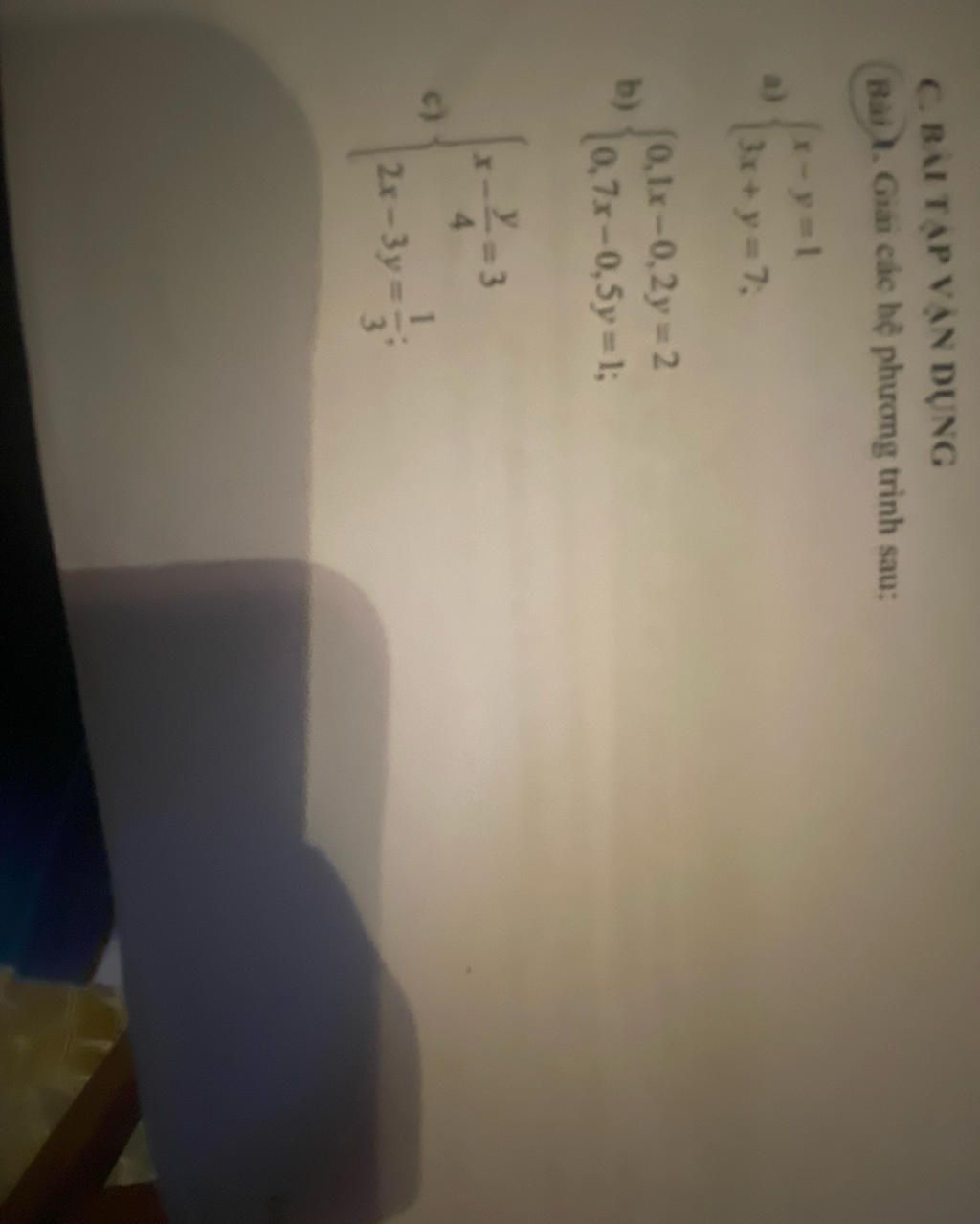 `b,` $\begin{cases} 0,1x - 0,2y = 2 (1)\\0,7x - 0,5y = 1 (2) \end{cases}$