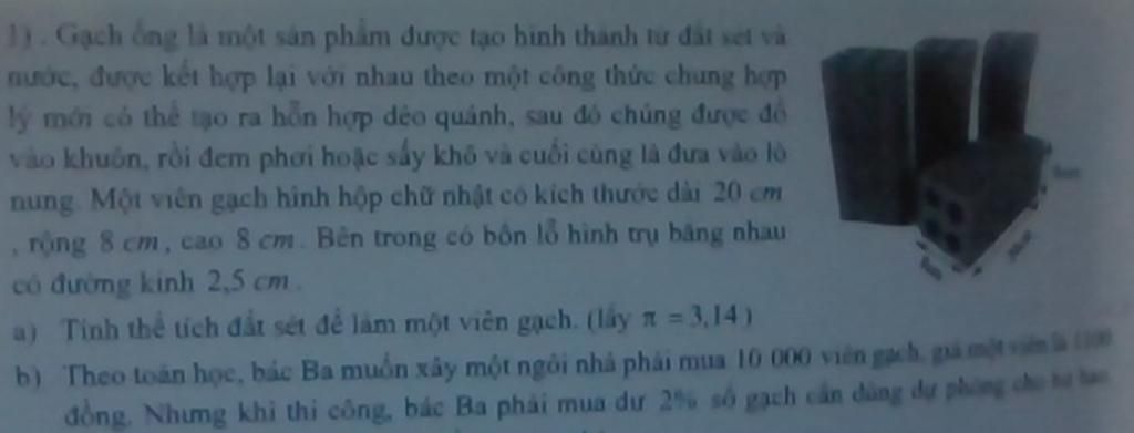 1/ Thể tích của viên gạch hình hộp chữ nhật là: