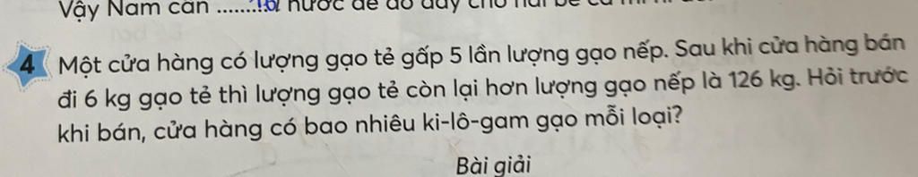 Một cửa hàng có lượng gạo tẻ gấp 5 lần lượng gạo nếp sau khi cửa hàng bán đi 6g gạo tệ thì lượng gạo tẻ còn lại hơn lượng gạo nếp là 126kg Hỏi trước khi bán cửa hàng có bao nhiêu kg gạo mỗi loại