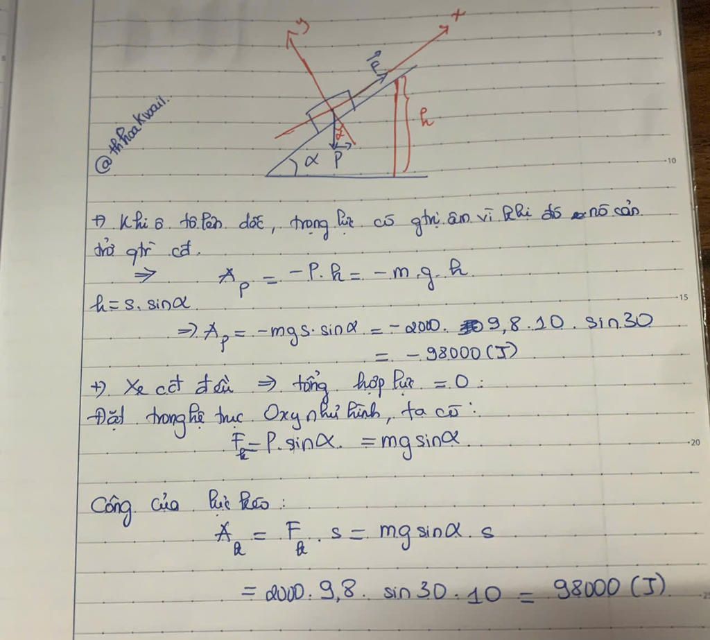 Một ô tô khối lượng m = 2 tấn lên dốc có độ nghiêng α = 30° so với phương ngang, vận tốc đều 10,8km/h. Tính công của trọng lực và công của lực kéo động cơ khi ô tô lên dốc được quãng đường 10m