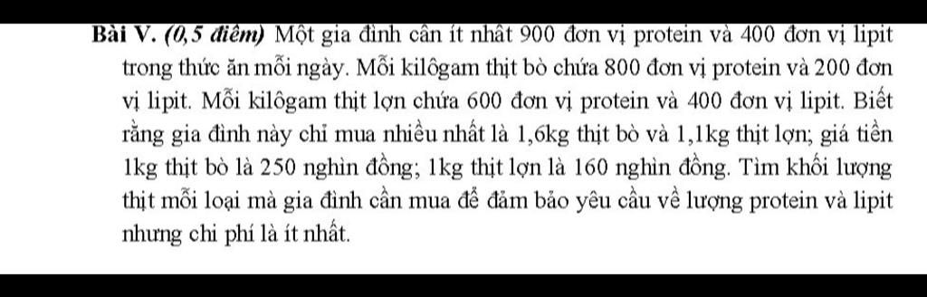 Bài V. (0,5 điểm) Một gia đình cần ít nhất 900 đơn vị protein và 400 đơn vị lipit