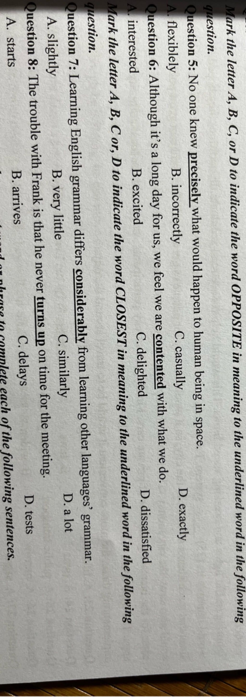 precisely (adv) chính xác, đúng >< casually (adv) tình cờ, ngẫu nhiên