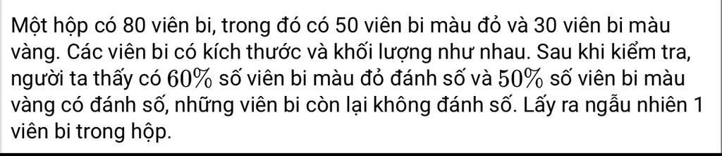 người ta thấy có 60% số viên bi màu đỏ đánh số và 50% số viên bi màu