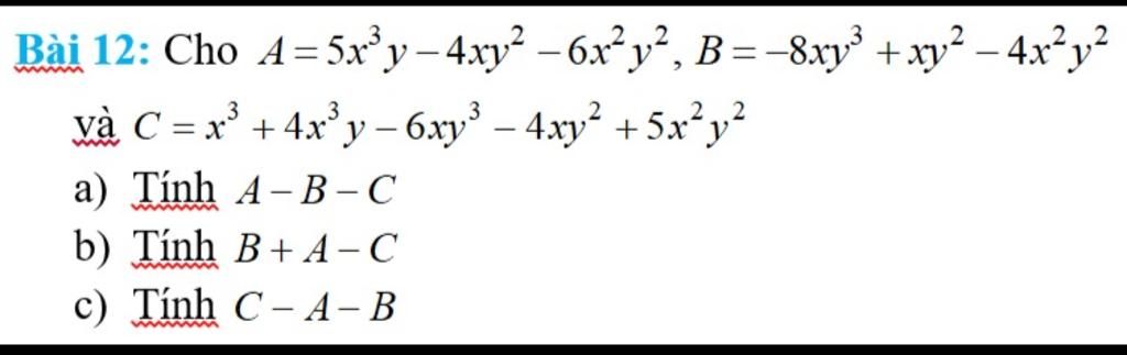 `b)` `B + A-C=(-8xy^3 + xy^2 - 4x^2 y^2) + (5x^3 y - 4xy^2 - 6x^2 y^2) - (x^3 + 4x^3 y -6xy^3 - 4xy^2 + 5x^2 y^2)`