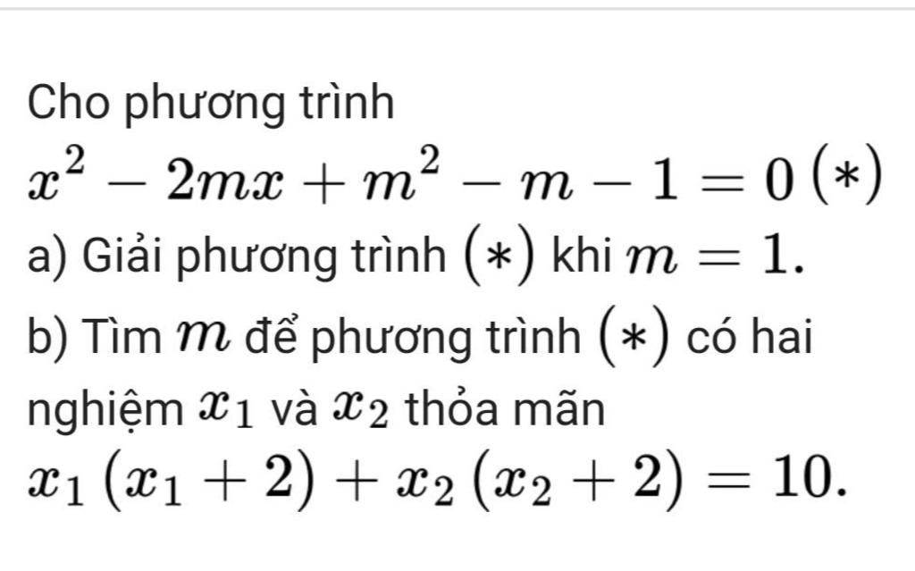 `a) x^2 - 2x - 1 = 0` `( x - 1 )^2 = 2` `x - 1 = \sqrt{2} hoặc x - 1 = -\sqrt{2}` `x = 1 + \sqrt{2} hoặc x = 1 - \sqrt{2}` `Vậy pt có S = { 1 + \sqrt{2} ; 1 - \sqrt{2} }` với `m = 1`