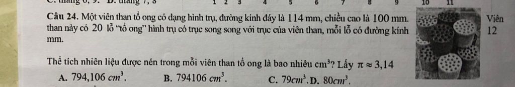 thể tích của `20` lỗ của viên than tổ ong là `:`