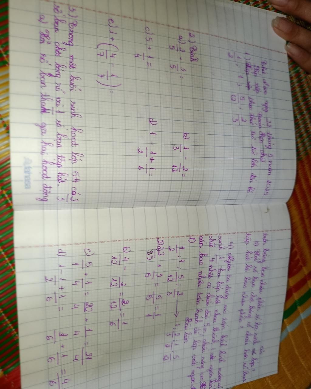 `2/3 - 1/4 = 8/12 - 3/12 = 5/12` (bạn)