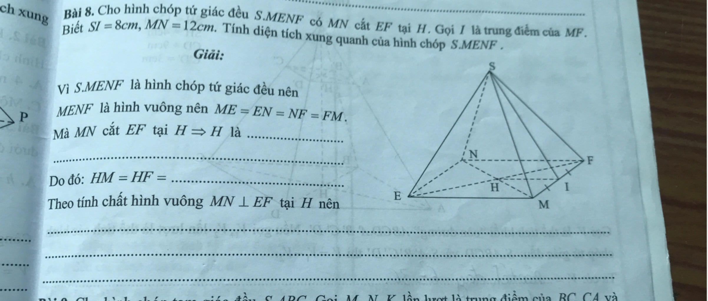 Vì $SMENF$ là hình chóp tứ giác đều nên $MENF$ là hình vuông nên $ME=EN=NF=FM=\dfrac{MN}{\sqrt2}=6\sqrt2$