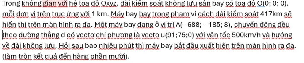 Trong không gian với hệ tọa độ Oxyz, đài kiểm soát không lưu sân bay có tọa độ C(0; 0; 0),