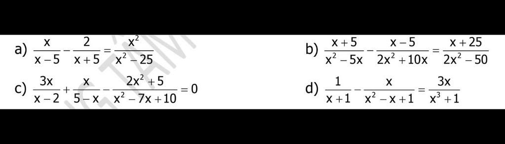 a) `x/(x-5)-2/(x+5)=(x^2)/(x^2-25)` `(x ne +-5)`