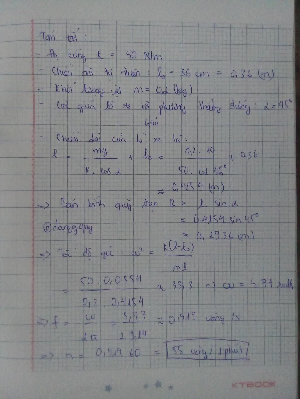 Lò xo k = 50 N/m, l0 = 36 cm treo vật m = 0,2kg có đầu trên cố định. Quay lò xo quanh một trục thẳng đứng qua đầu trên lò xo, m vạch một đường tròn nằm ngang hợp với trục lò xo góc 450. Số vòng quay trong 1 phút là?