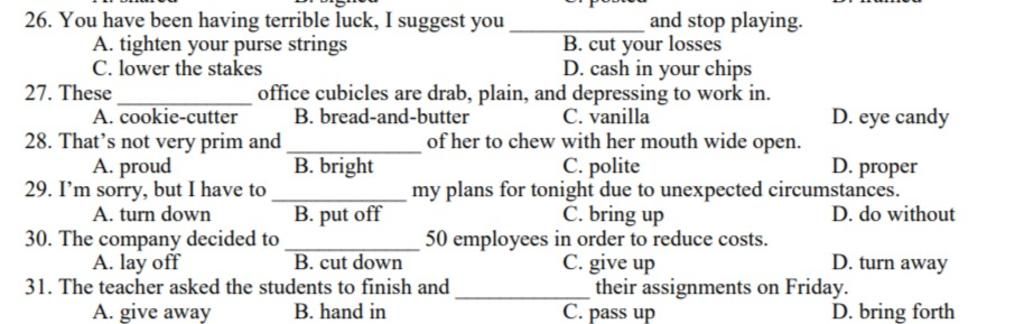 30: A ( lay off: có nghĩa là xa thải , cut down + on mang nghĩa là cắt giảm thứ j , give up là từ bỏ , turn quay đi )