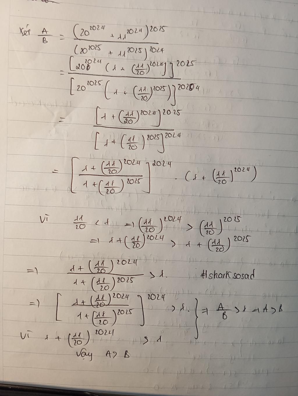 so sánh: A=(20^2024+11^2024)^2025, B=(20^2025+11^2025)^2024