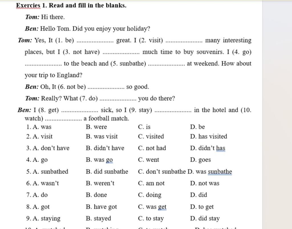 `10`. watched (vì trong bài bạn không cho đáp án, nhưng mà bài đọc đang sử dụng thì `QKĐ` nên động từ watch sang quá khứ sẽ là watched)