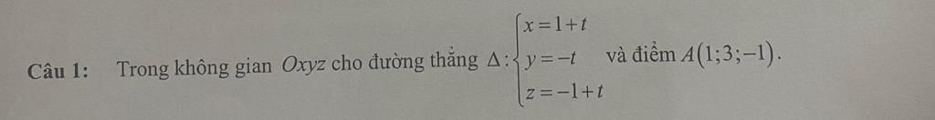 Lại có: $\vec{u}=(1, -1, 1)$ là vector chỉ phương của $\Delta$