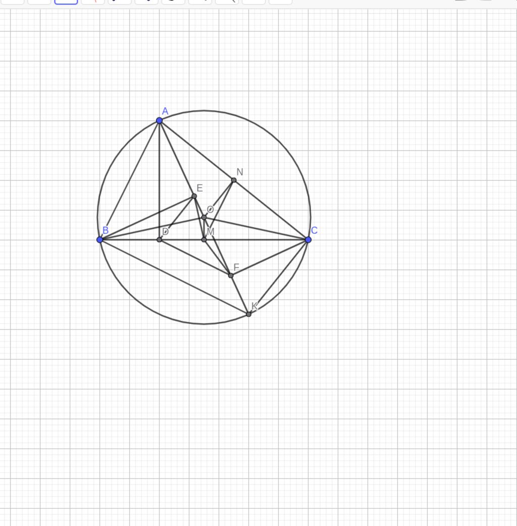 Cho tam giác ABC nhọn nội tiếp đường tròn (O). Kẻ đường cao 4D của tam giác ABC, AK là đường kính của đường tròn (O). M và N lần lượt là trung điểm của BC và AC. Gọi E và F lần lượt là hình chiếu của B và C trên AK.