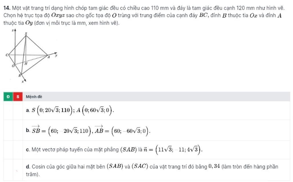 `c,` Ta có: `vec{n}=[vec{SB};vec{AB}]=(11sqrt3;11;4sqrt3)`