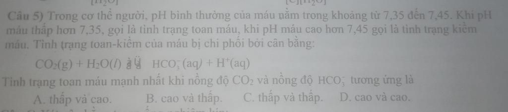 Khi toan máu, pH thấp đi tức là lượng `H^+` tăng, khí đó cân bằng cần chuyển dịch theo chiều thuận.