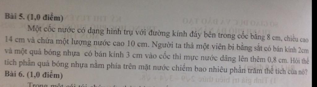 và một quả bóng nhựa có bán kính 3 cm vào cốc thì mực nước dâng lên thêm 0,8 cm. Hỏi th ...