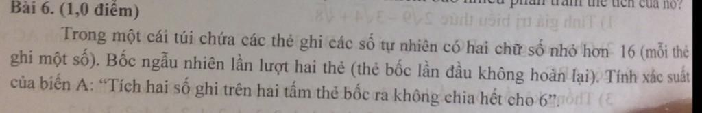 Các kết quả thuận lợi cho biến cố `A:"`Tích hai số ghi trên hai tấm thẻ bốc ra không chia hết cho `6"` là`:`