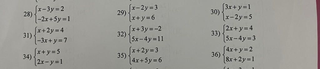 `{(x-3y=2(1)),(-2x+5y=1(2)):}`