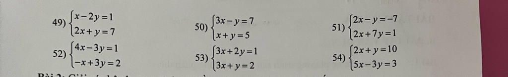49) $\begin{cases}x-2y=1\\2x+y=7\\\end{cases}$