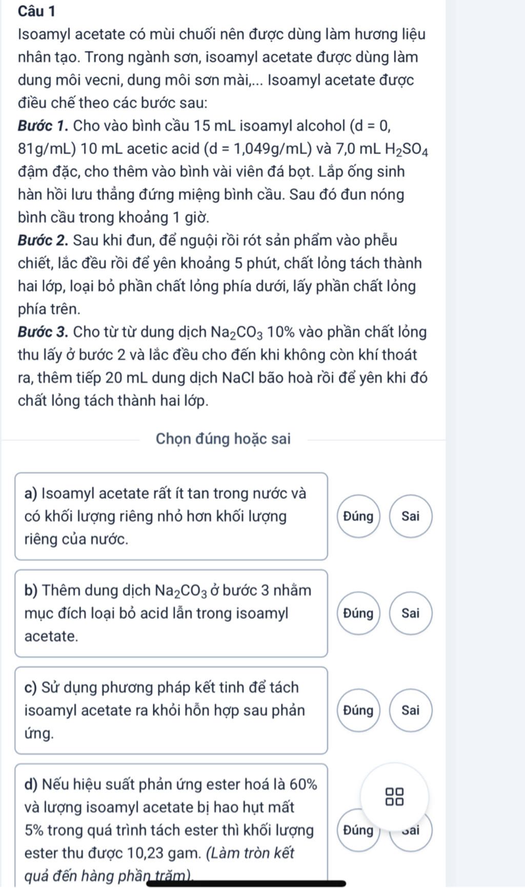 `+)` Dùng phương pháp chiết để tách isoamyl acetate vì isoamyl acetate có độ tan thấp hơn nhiều với các chất dư.