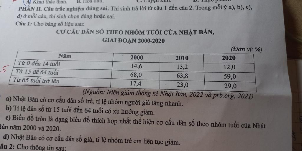 d) Nhật Bản có cơ cấu dân số già, tỉ lệ nhóm trẻ em liên tục giảm => Đúng