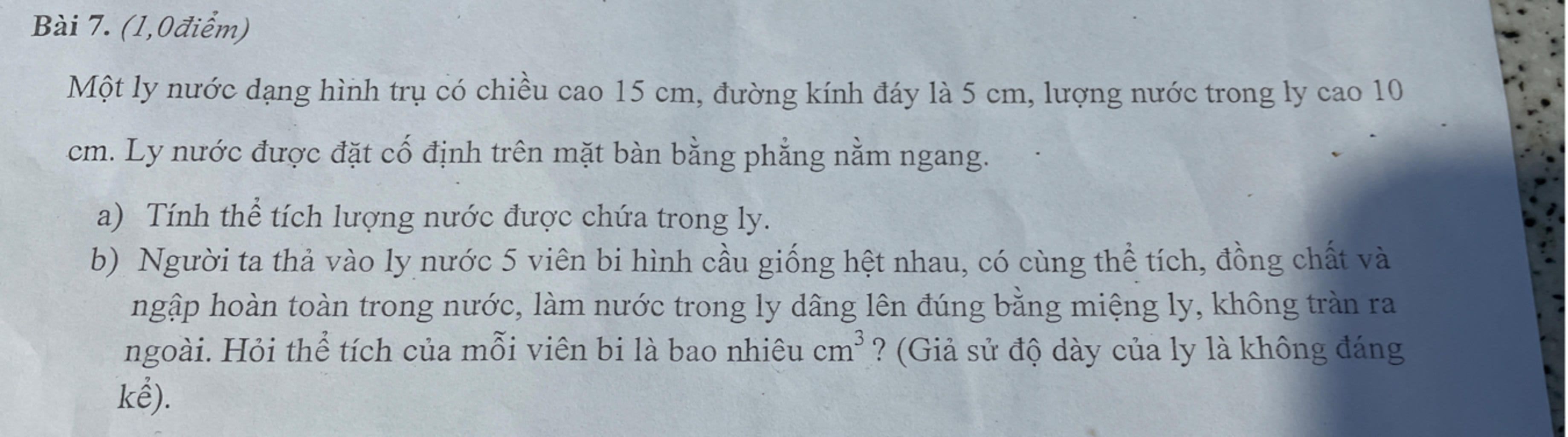 tổng thể tích nước tăng thêm = tổng thể tích 5 viên bi 5 viên bi giống nhau=> chia tổng thể tích cho 5 để tìm thể tích 1 viên bi