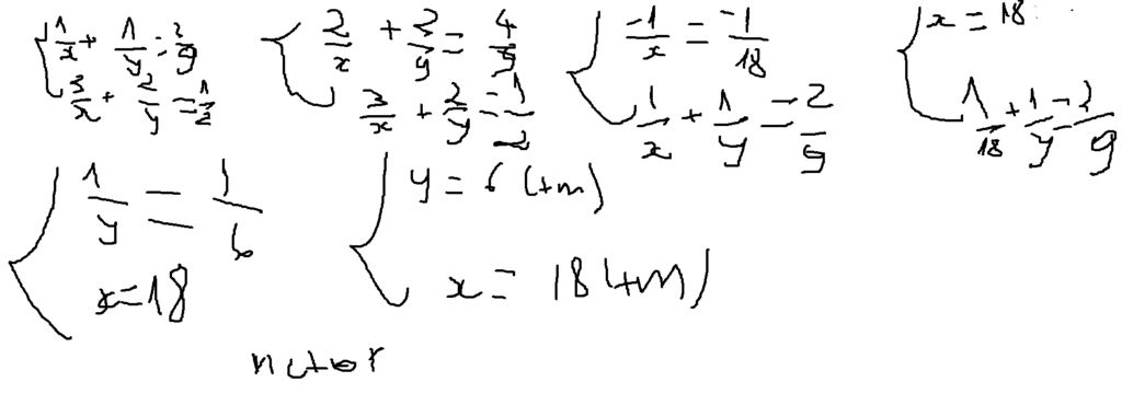 `{(1/x+1/y=2/9(1)),(3/x+2/y=1/2(2)):}`